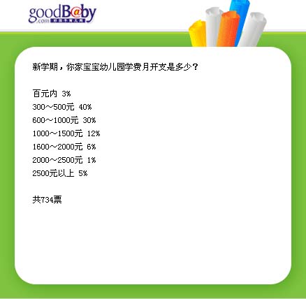 开学前一周,好网针对幼儿园的收费话题展开了一次小调查,总计有734名网友参与了我们的调查活动。
