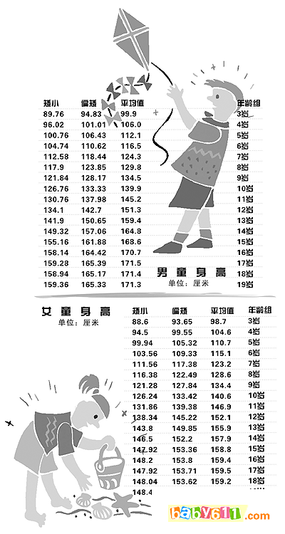 下面是全国城市男、女儿童身高表,该表利用了统计学的原理制作而成。以10岁男童为例,他们的身高平均值为139.9厘米,若身高在126.76—133.33厘米之间,说明该男童身高偏矮;若身高小于126.76厘米,说明该男孩身高矮小。家长可以以此类推。