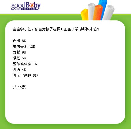 上一周,好网对宝宝们的兴趣做了一次调查,有半数以上的网友表示选择兴趣班要尊重孩子自己的兴趣。