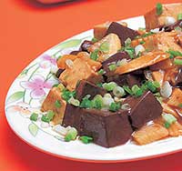 原料:鲜豆腐200克,熟猪血块200克,瘦猪肉100克,熟冬笋15克,酱油10克,精盐3克,白糖10克,白胡椒粉2克,葱段5克,植物油、淀粉、鲜汤适量。