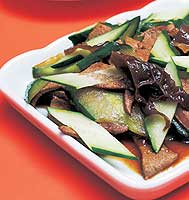 原料:黄瓜100克,猪肝150克,水发木耳10克,植物油250克(实际用75克),酱油、精盐、白糖、淀粉、葱、姜、蒜等适量。