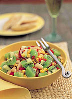 材料:奇异果、玉米粒、红洋葱、柠檬汁、盐、斑豆或者通心粉