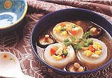 3、热锅入油,炒香洋葱及香菇,入豆肠、三色蔬菜、香菜拌炒后,填入白萝卜中。