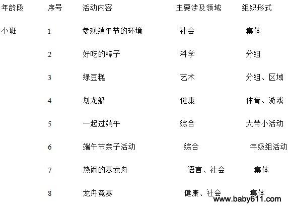 (5)家长园地:介绍主题活动中须请家长配合的内容、主题活动进展情况等资源利用(1)请家长协助幼儿进行相关资料的调查及收集,丰富幼儿的相关经验;(2)请家长来园参加活动,和老师、幼儿共同感受节日做做、玩玩、尝尝的快乐;(3)在本地组织"赛龙舟"活动时,组织师幼前往参观并摄像五、主要教育活动方案(一)小班活动一:参观端午节的环境主要涉及领域:社会活动目标: