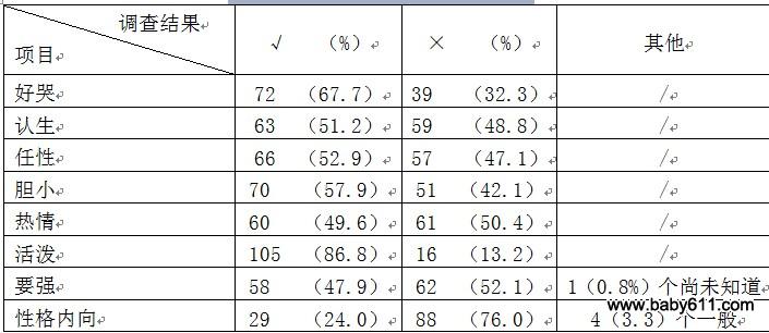 从表二可以发现,有一半以上幼儿存在着好哭、认生、任性、胆小等特点,其中有67.7%的幼儿好哭,有的一点小事就会哭个不停,有57.9%的幼儿胆小、51.2%的幼儿认生,怕见生人,不敢表达自己的愿望;但大部分幼儿(86.6%)的个性比较活泼、开朗,要强的幼儿占47.9%,而性格内向的幼儿仅占24%。