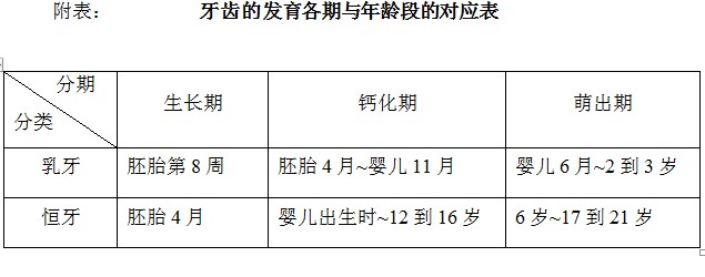 另外,尽管孩子的乳前牙是从5-6岁开始替换,但乳磨牙要到12-13岁才能替完。如果乳牙患了龋齿而不治疗,不仅会影响咀嚼功能,损伤口腔粘膜软组织,而且当乳牙龋齿发展成根尖炎后,就会影响到颌骨内乳牙下方恒牙胚的发育,造成恒牙发育不良甚至停止发育;如果在正常乳恒牙替换之前乳牙早失,就会出现恒牙萌出位置不够,造成恒牙排列不齐,从而影响孩子一生的口腔健康。所以,孩子的牙齿保护尤为重要,乳牙龋齿也应及时治疗,只要治疗及时得当,也是不会对恒牙替换造成有不良影响的。(附表:牙齿的发育各期与年龄段的对应表)