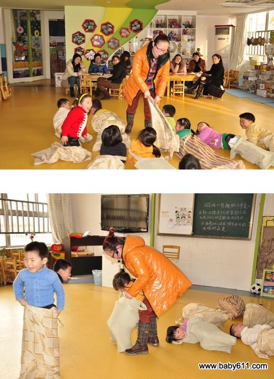 (1)不套袋子幼儿探索各种爬法,教师重点强调两种爬的动作要领。(手膝着地的爬法、肘膝着地伸缩爬法)(2)老师用儿歌引导幼儿套上布袋,变成虫宝宝,进行各种爬得练习。