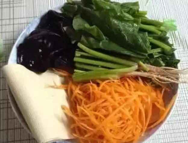 用料:面粉、胡萝卜、木耳、豆腐皮、青菜,香油