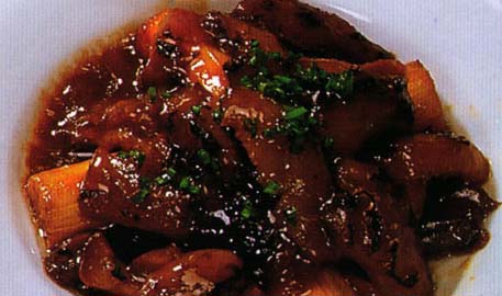 2、锅上火放油烧热,放入大葱段,小火炒至金黄色,倒出;锅留底油复上火,倒入海参片、肉片煸炒,烹入绍酒、鲜汤,加美极鲜酱油、白糖、精盐、味精烧沸,转中火烧至海参软烂,倒入大葱段,湿淀粉勾芡,撒入胡椒粉、葱花装盘即成。
