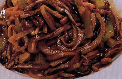 原材料:净鳝鱼肉,50克,香芹50克,冬笋丝20克,洋葱丝20克,蒜末、酱油、绍酒、精盐、味精、白糖、香醋、胡椒粉、湿淀粉、植物油各适量。