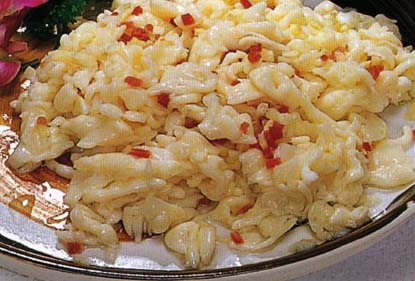 2、锅上火放油烧热,倒入蛋清奶糊,用手勺轻轻推动至蛋清奶糊凝固成形,起锅装盘,撒上火腿末即成。