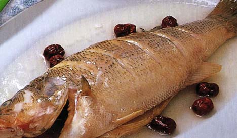 原材料:鲈鱼1尾(约600克},北芪25克,红枣8粒,生姜、绍酒、精盐、鲜汤各适量。