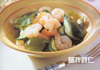 材料:虾仁60克、海带10克、小黄瓜50克。