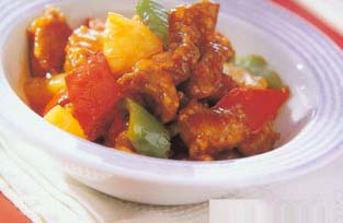 材料:里脊肉片140克、青椒20克、红椒20克、洋葱30克、菠萝20克、鸡蛋黄1个。