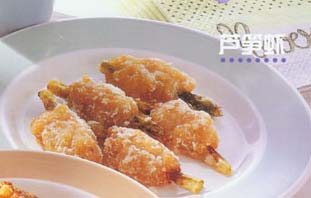 4 锅中放油,待油热后转成中火,放入蒸好的芦笋虾,炸至金黄色即可。