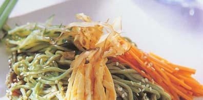3 食用时,将黄瓜丝、海苔丝、蛋丝、胡萝卜丝等材料混合,蘸酱汁食用即可。