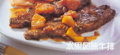 1 橙、苹果、菠萝分别去皮、切小块,与牛排、葡萄酒一起浸泡约30分钟,将牛排取出。