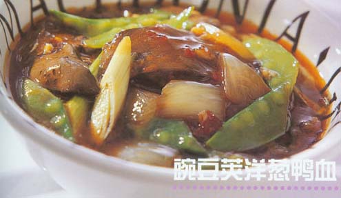 豌豆荚50克、洋葱80克、鸭血150克、青蒜40克