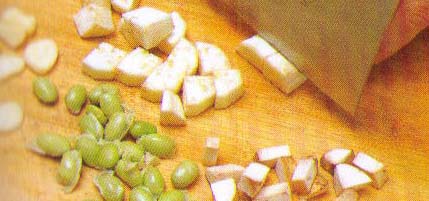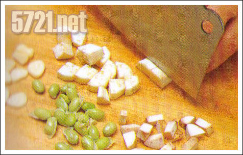 1、将嫩茄子去皮切成中丁,口蘑切片,毛豆用开水先煮熟,蒜子肉切片。