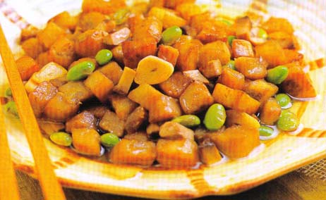 3、再加入口蘑、毛豆,注入少许清汤,调入盐、生抽王,用小火烧透,用湿生粉勾芡推匀出锅入碟即成。