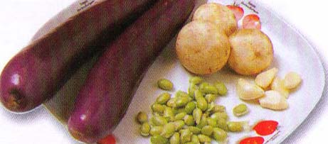 原料:嫩茄子300克,口蘑50克,毛豆50克,蒜子肉10克。