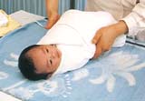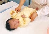 1 将宝宝放在浴巾上,脱去外衣,用浴巾包裹全身。