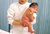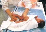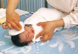 10 在宝宝的腋窝、腹股沟等皱摺处扑上爽身粉。(请注意照片中护士长的左手,妈妈也应用同样手势保护宝宝的口鼻,以免宝宝吸入粉尘。如果是女宝宝,建议不要在她身体下部使用爽身粉,因为这可能会增加成年后发生卵巢疾病的几率。)