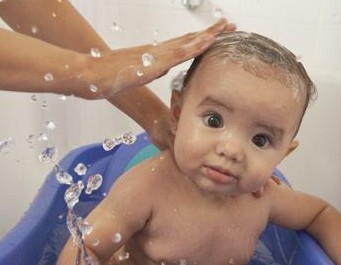 洗头:先将婴儿洗发香波在手中倒少许,轻轻在宝宝头上揉洗,注意不要让水和香波流进宝宝的眼睛里及耳道内,最后请另一个人帮助用小水壶的温水冲净头发并擦干。