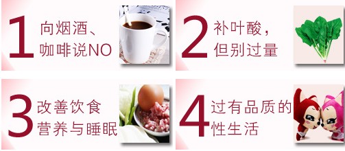 男性吸烟酗酒偏食等不良生活习惯都会降低和损害精子的数量和活力。男性通常要3个月的时间才能产生新的精子。而且,抽烟喝酒据说还容易生下脑瘫儿。所以,最好在3个月前就让家里那位把“不良”生活习惯通通纠正了吧!