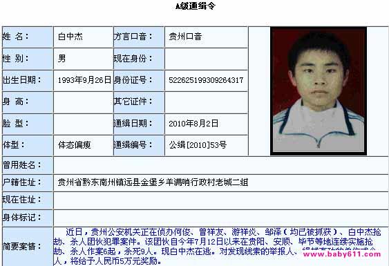 根据公安部发布的A级通缉令,近日,贵州公安机关正在侦办何俊、曾祥友、游祥炎、邹泽(均已被抓获)、白中杰抢劫、杀人团伙犯罪案件。该团伙自今年7月12日以来在贵阳、安顺、毕节等地连续实施抢劫、杀人作案6起,杀死9人,白中杰是其中的在逃人员。为了缉拿白中杰,公安部门悬赏通缉,对发现线索的举报人、缉捕有功的单位或个人,将给予人民币5万元奖励。