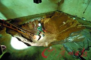 记者在现场看到,地板下用来填充地基的不是泥土,而是松软的河沙。当救援人员沿塌陷口向下挖时,四周的沙子便流了下来,救援人员只好边挖沙子边用木板固定四周以防沙子不断向开挖处聚拢。由于事发现场空间狭小,救援工作全靠救援人员手工进行。至昨日下午记者发稿时,钟荣发夫妇还未找到,救援工作仍在紧张进行当中。