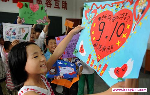 9月9日,山东省诸城市新艺学校的小学生们为老师献上自己亲手制作的贺卡、手工艺品等,表达教师节的祝福,感谢老师的关爱。