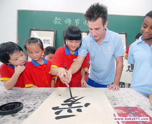 9月9日,浙江省上虞市华维文澜小学的学生和来自加拿大的英语外教肖恩共同用毛笔书写大大的“爱”字,庆祝9月10日第26个教师节的到来。