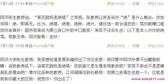 新浪娱乐讯 7月12日,同济大学人文学院教授张生在上海一家报纸上发表文章,批评身为《中国达人秀》评委的周立波思想肤浅、教养低下。12日中午,周立波通过微博作出回应,将张生比喻为狗。13日上午,周立波再次在微博上评论此事,称“骂你都嫌口脏但你命真好!居然有幸成为周立波口中的半口脓痰!来而不往非礼也!以下是本人对你的绝骂:有教无养,同济耻辱!走好!”
